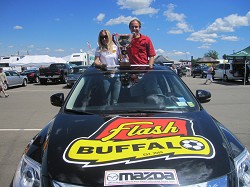 One of the key aspects to the Flash and Mazda’s promotion of Women’s soccer will be a unique paint scheme on the #49 RX-8 that is driven by Joe Sahlen. The entire car will be painted to mirror image the Western New York Flash logo. The RX-8 will be primarily red, with black bumpers. And the car will be accented with yellow “Flash” lightning bolts. Emblazoned next to the Sahlen’s logo on the hood and both rear panels will be the Flash name branding. (Similarly, both the logos for Sahlen’s and Flash are waving flags, and sharing the same cursive font) Then to top off the distinctive look will be the roof that will be decaled as a large soccer ball. In that way, no one can miss the theme to this racer.