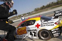 One special promotional program that all Mazda team participated in at Barber Motorsports Park was an American Red Cross tie-in. Each GT Mazda team carried special American Red Cross branding on their fenders and hoods. The branding encouraged individuals to donate money to assist those in need in Japan due to the national disasters. The instructions detailed: Text REDCROSS to 90999 to Give $10 - Standard Message and Data Rates May Apply.