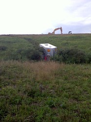 To compound the situation for Team Sahlen, major construction on the highway, saw a huge road bump break the hitch on the stacker trailer that goes along behind the team Toterhome. Fortunately, no one was hurt, and the Stacker Trailer trailed off the road, went down an embankment, and came to an eventual stop in a patch of trees. The trailer was eventually pulled out and taken to a Truck Stop, where a new hitch was welded on. Thus allowing the Stacker and all contents inside to be able to make the trek across the Canadian border.