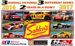 Posted (11/25/2017) - During the 2017 season, Team Sahlen competed in 3 different endurance sports car series: American Endurance Racing, World Racing League and ChampCar Endurance Series. Each series offered a unique set of car specs and competition rules that the team had to adjust for. At the end of the year, the team was successful in securing OVERALL Victories in each of the 3 series. These results were achieved when not always classified in the Top Class of the series. This achievement was even more noteworthy by the factor of reaching this mark for the second straight year. Wayne Nonnamaker shared his thoughts - “Each of these 3 series are very strong. Being competitive in all three is very tough. We ask a lot of our crew to accomplish this targeted goal each year. Being able to win in all three, two years in a row is remarkable, and we are proud to have accomplished this goal!” Over this 2 year span, Team Sahlen has used a variety of race cars to accomplish this mark. Team Sahlen campaigns 4 Porsche Caymans and 3 Mazda RX7s. In total, 5 of the 7 race cars have contributed to the 10 OVERALL race victory tally. “To win at these long endurance events requires both speed and reliability. Having five different race cars come through to secure Overall Victories is mark I find the most satisfying. The crew does such a fantastic job preparing our Team Sahlen race cars so they can run the full distance. And then to be able to extract the speed from not just one but five race cars is not always easy, but is most certainly a gratifying achievement.” – shared car chief Tony Artino. Beyond the Overall race victories, Team Sahlen has been able to achieve being 1st in Class a total of 16 times as well as 41 class podiums in the 2 year time period. Joe Nonnamaker shared his thoughts on this mark – “There are many races where we have been competing in 2 different classes in the same race. Everyone on the team has to keep on their toes as we often have multiple race strategies playing out to try and win in 2 different classes with 2 different speeds of race cars. This means gauging different fuel strategies, pit stop sequences and yellow flag conditions all at the same time for over 7 to 9 hours.” Of the 10 Overall Victories, none of them were carbon copy results. Many of the wins had very interesting dialogues to complement the storyline. Joe Sahlen shared his thoughts - “There are so many of the Overall victories that stand out. Winning overall in the World Racing League with our Mazda RX7s built to the more restrictive ChampCar Endurance Series rules was satisfying. Winning with our Porsche Cayman versus an ELAN Prototype was a true underdog storyline. But achieving the 1st Worldwide Overall Endurance Victory with a Porsche PDK Automatic Transmission is one I will remember for years to come.” Team Sahlen’s history in Endurance Sports Car Racing in North America dates back beyond the past two years. In fact, the team’s history spans all the way back to origins of production based endurance sports car racing to 1984. Team Sahlen has been able to race in and secure victories in long wide array of past championships that includes: SCCA Escort Endurance Series, Firestone Firehawk Series, IMSA Sports Car Endurance Championship, Motorola Cup, Grand American Continental Tires Series, and Grand American ROLEX Sports Car Series.